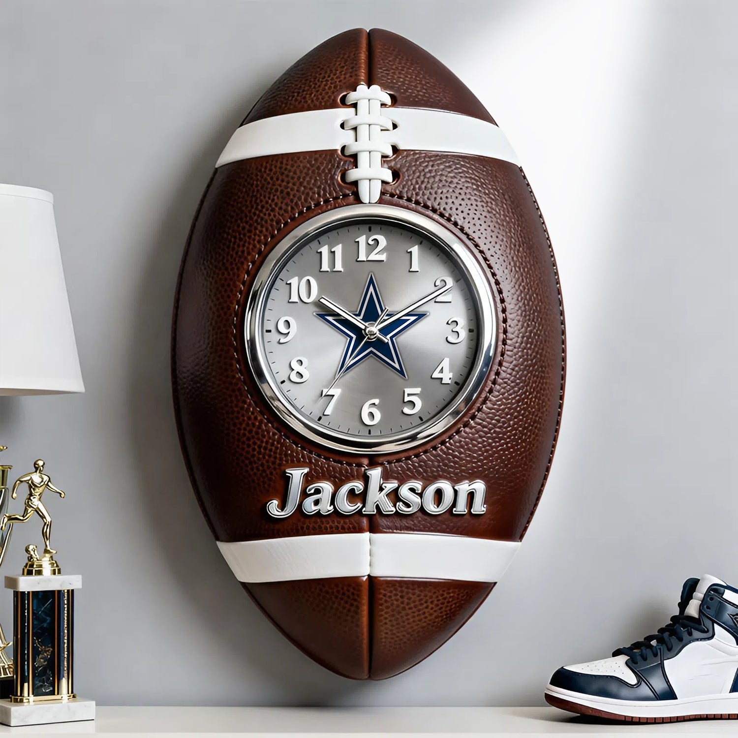 This personalized rugby fan clock is designed for passionate and energetic sports enthusiasts, bringing the thrill of the game into every moment of life. The overall design is a three-dimensional rugby ball, with dark brown leather texture and white stitching details authentically recreating classic American style. The clock face is cleverly embedded in the center of the ball, with clear and concise numbers and smooth, natural hands, combining dynamism and practicality.